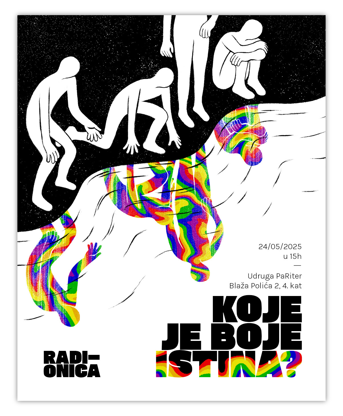 Visual identity and advertisements (posters, event covers, social media posts, stickers) for different events within a project titled “What Color Is the Truth?” ("Koje je boje istina?) which addresses the issue of pathologizing sexual orientation and the attempts to change sexual orientation through the so-called conversion therapy. It represents a response to a deeply rooted social phenomenon that still affects many members of the LGBTIQ+ community, especially in countries where this pseudoscientific intervention is legal or socially tolerated. The project was realized by Proces, an association for the promotion of queer culture and LGBTIQ+ rights.